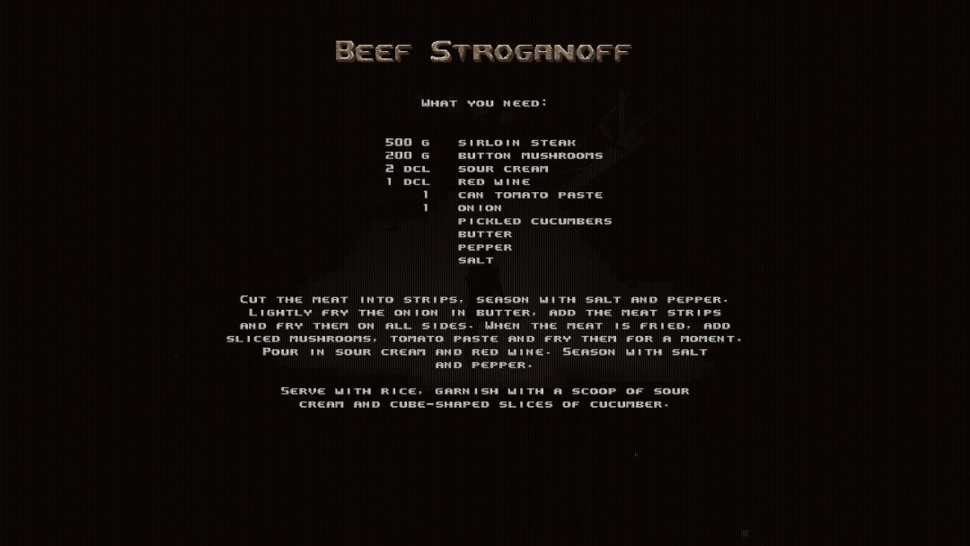 The game as a whole is refreshing. It is built with quality, by a single person, and is enjoyable throughout. A welcomed break from the well-known titles today that remove any single-player or co-op element altogether. It was nice to part from the unneeded glint and shine of AAA shooters to appreciate a well-thought-out game that delivered in every single area it wanted to. Rare to say the least among its contemporaries. The ridiculousness of the game feels like it slowly intensifies as you play almost unnoticeably until you get to the end and you ask yourself is that Putin? I can certainly see an enjoyable second playthrough but am more than satisfied with having just beat it for the first time. I even learned a few recipes.