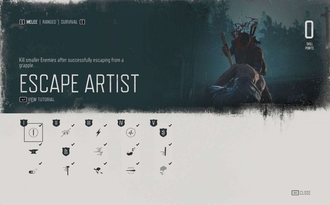 The skill tree is separated into three sections: melee, ranges, and survival. I got my melee up early because your guns are pretty poopy from the jump and melee is always something you need. There comes a time when it doesn’t matter what you pick because, like I said, you get to god-tier by the 75% completion mark.