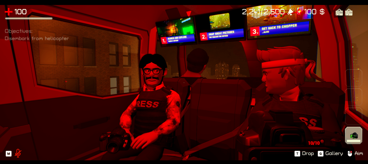 The best strategy so far seems to be to spend a few minutes inside a building being terrorized, then head outside to snap some titan-class mutants roaming the streets. It’s important to get your camera to the helicopter to receive and see your photos as well, even if you find yourself incapacitated, anyone can pick up your camera and return it for those sweet journalistic points. This is by far the best part of each round, going back to the headquarters and seeing which pictures had the highest impact and which one made the front page.