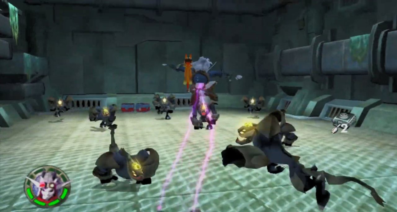 There’s a mission in the sewers where you’re finding some artifact for Krew, and a pair of metal heads are approaching you. As they get closer, the lights go out and all you can see if the shiny gemstone in their heads. The sudden sound of the light going out and the screen going completely dark was awesome back in 2003, and it still gets me to jump today.